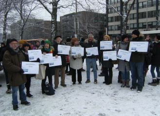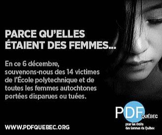 Plusieurs membres de PDF Québec, hommes et femmes, se sont rassemblées à Montréal pour se souvenir des 14 femmes tuées le 6 décembre 1989 à Polytechnique parce qu'elles étaient femmes.
